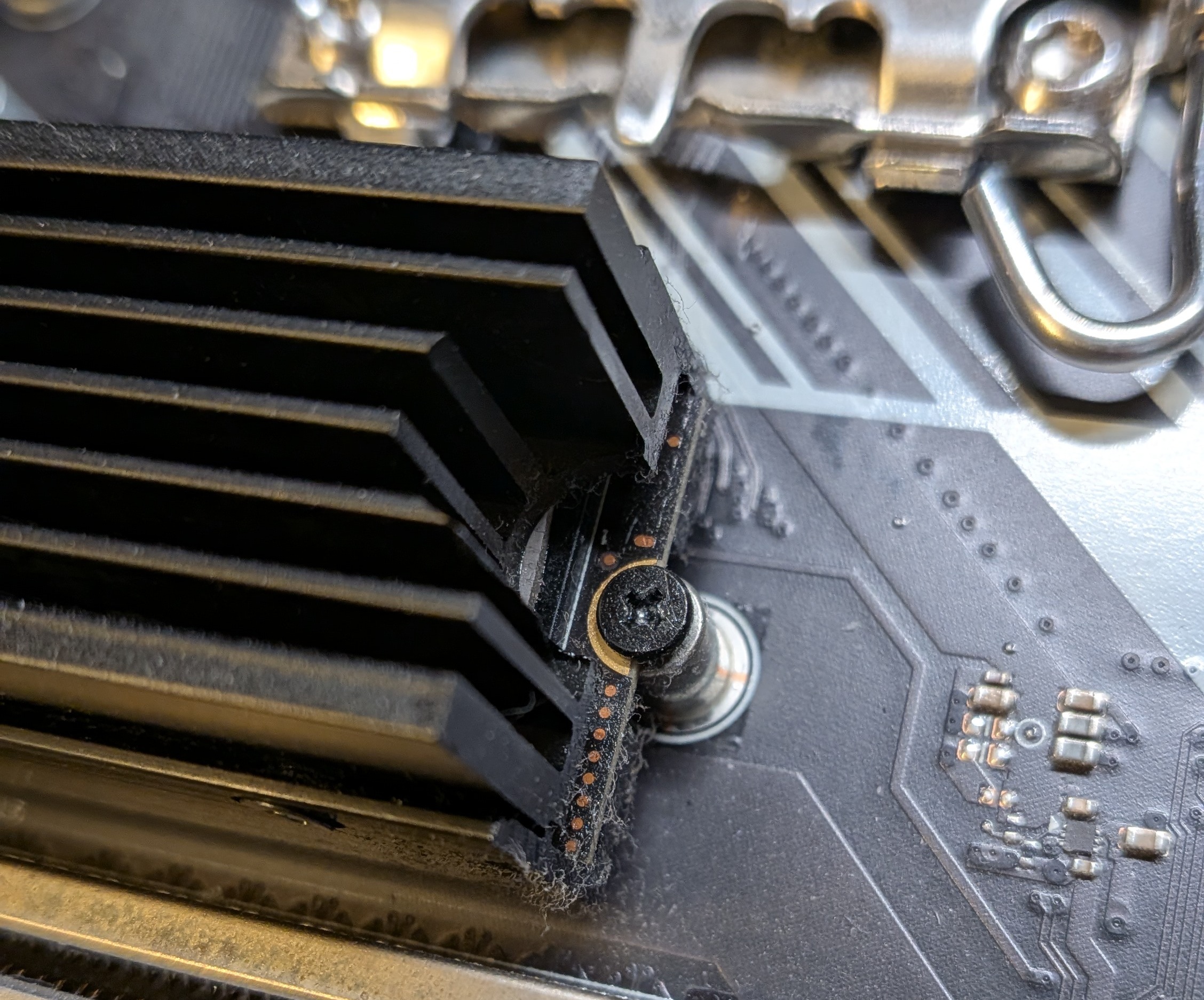 と、このように順調に分解を進めていたところ、マザボからストレージを取り外す工程になって問題が発生します。