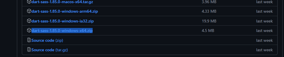 ②最新バージョンのリリースからWindows用のzipファイル(例dart-sass-1.85.0-windows-x64.zip)を探してダウンロードする。