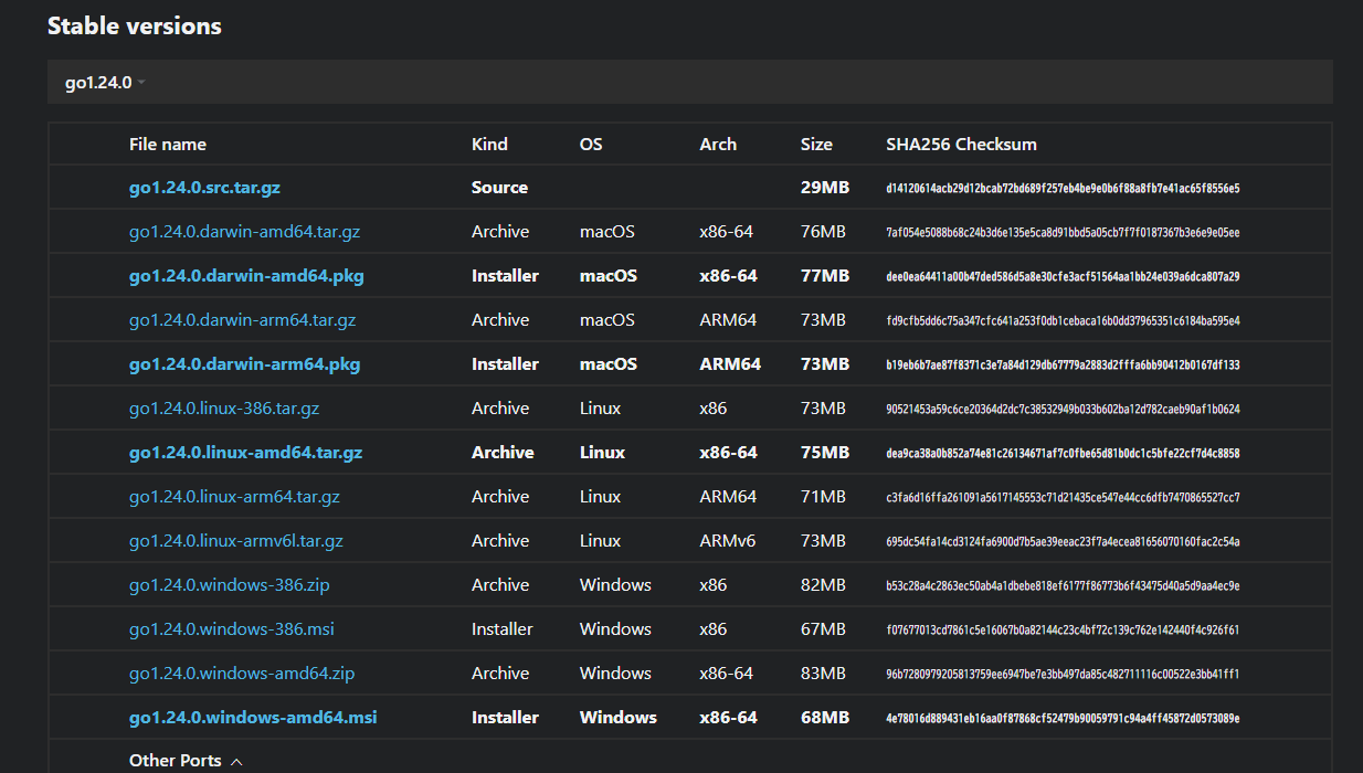 ②Stable versionsリスト内からgox.xx.x.windows-amd64.msiを探してダウンロードする。