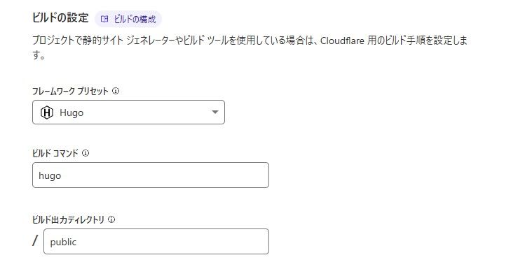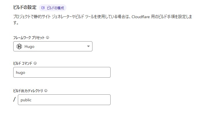 ④ビルドの設定では「フレームワークプリセット」でHugoを選択する。